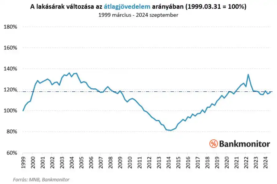 A közgazdászok és ingatlanpiaci elemzők jelentős része (beleértve az MNB-t is) arra a kérdésre, hogy indokolható-e a kialakult árszint, az átlagos jövedelem változását veti össze az átlagos ingatlanár-változással. A jövedelem határozza meg ugyanis a megtakarítási képességet (önerő felhalmozás) és a hitelképességet (képes lesz-e a hitelt felvevő havonta törleszteni). Ebben a megközelítésben az elsődleges válasz, hogy nincs itt semmi látnivaló, minden a legnagyobb rendben van. Ezt támasztja alá az alábbi ábra is, mely szerint 2024 harmadik negyedévében a lakosság átlagos jövedelméhez képest a lakások átlagos árszintje 15%-kal marad el a csúcsértéktől (2003-2004).